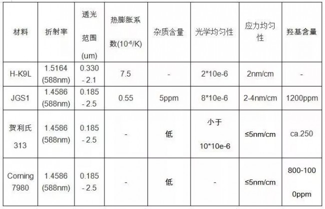 对于紫外、YAG光纤和半导体激光器等,常用的光学元件材料有H-K9L、紫外熔石英(JGS1)、贺利氏313和康宁7980等。相比较于K9玻璃,石英玻璃有更低的热膨胀系数,更少的杂质含量,更好的光学均匀性,因而受到高功率激光市场的青睐。在高功率和超快激光应用领域,国内厂家更倾向于国外的贺利氏和康宁材料。
