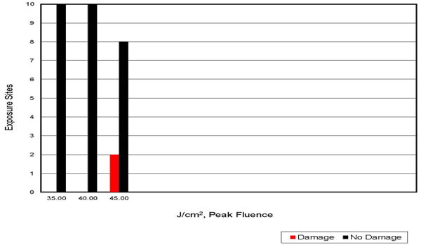 检测的激光损伤阈值为40J/cm2,如图二所示。检测条件:测试激光波长为1 064 nm,脉冲宽度为10 ns,样品的测试采用1-on-1的方式进行,取0损伤几率时的能量密度作为样品的损伤阈值。目前还存在的问题是成膜材料的纯度有待提高。