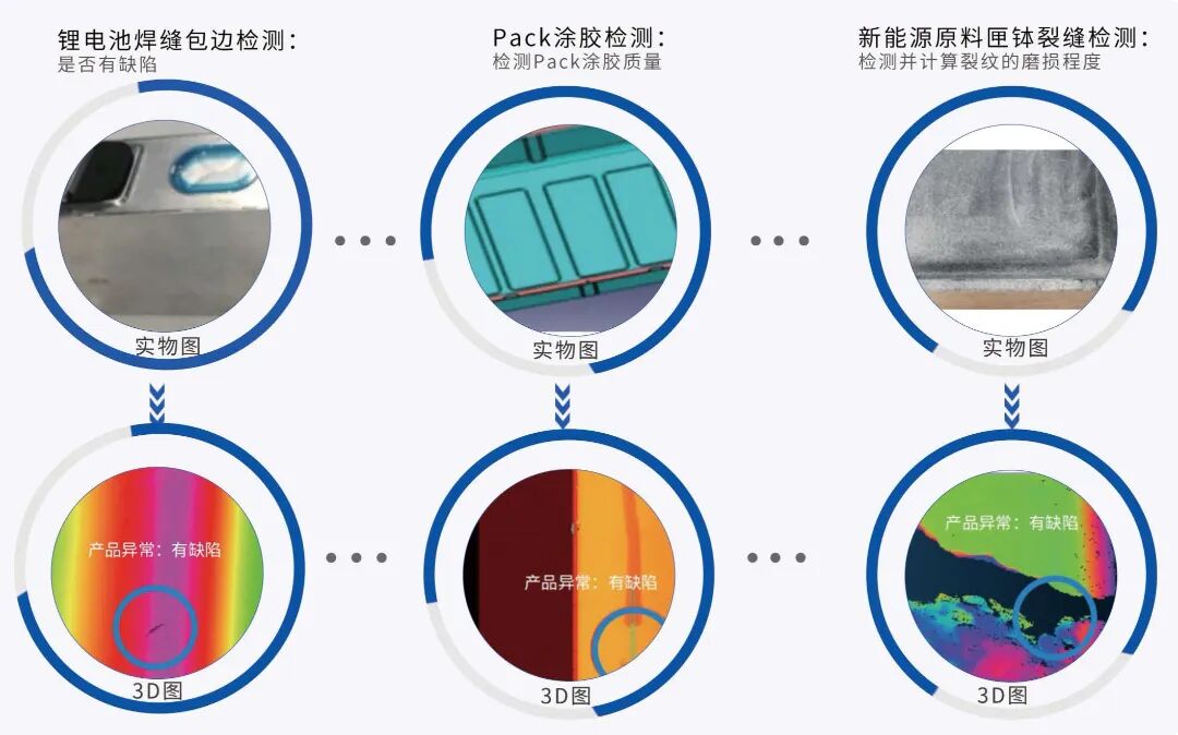 在新能源领域中,富唯智能科技提供全套3D检测为主的机器视觉检测方案,扫描信息全面、立体、直观,能涵盖整个模组的数据,满足客户对于外观瑕疵和尺寸测量等检测要求。