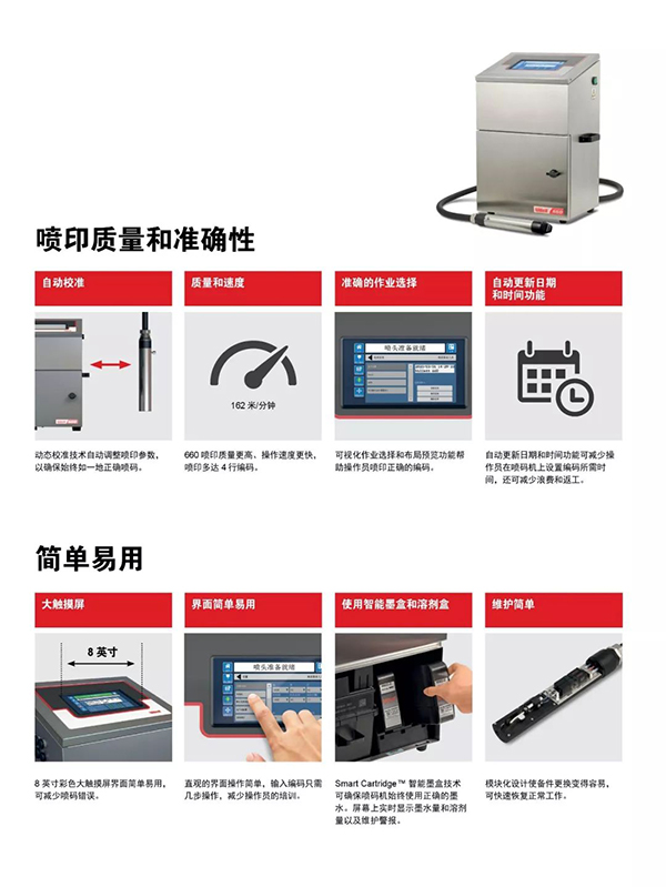 该系列小字符喷码机性能稳定、质量出色,使用由国际知名制造商提供的直观的用户界面。
