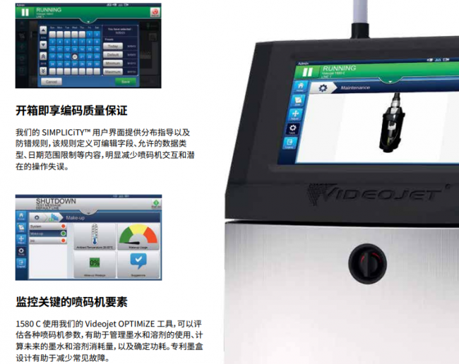 1.Videojet SIMPLICiTY™ 用户界面提供开箱即用的编码质量保证功能,以及定义可编辑字段、数据类型限定、日期范围限制等内容的防错规则,显著减少操作员的干预和潜在的操作失误