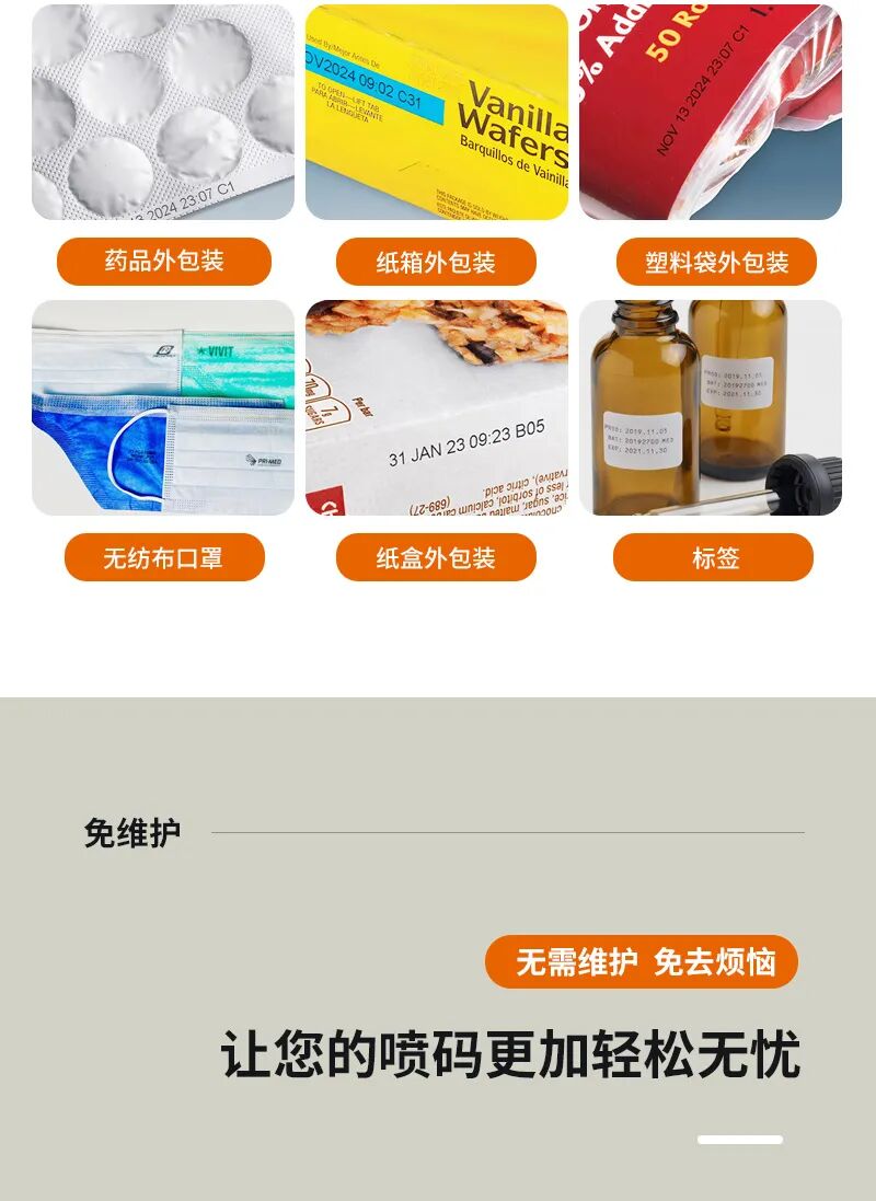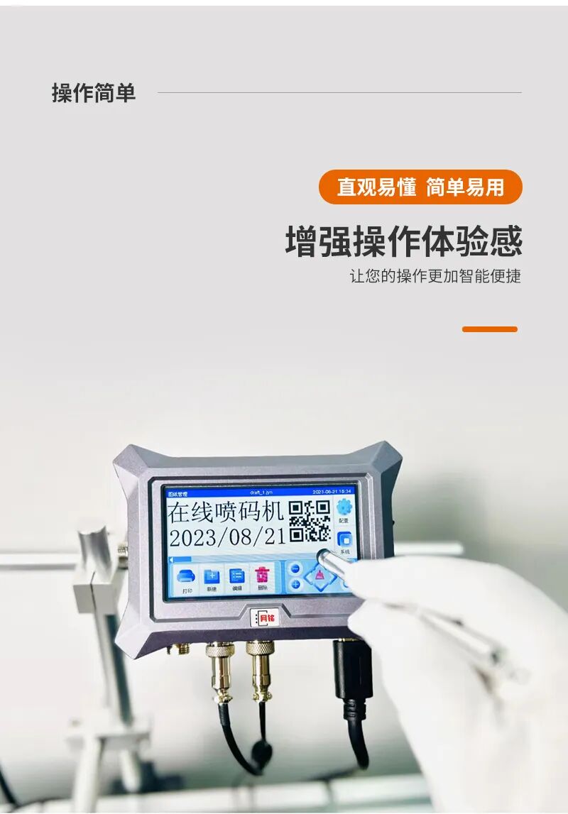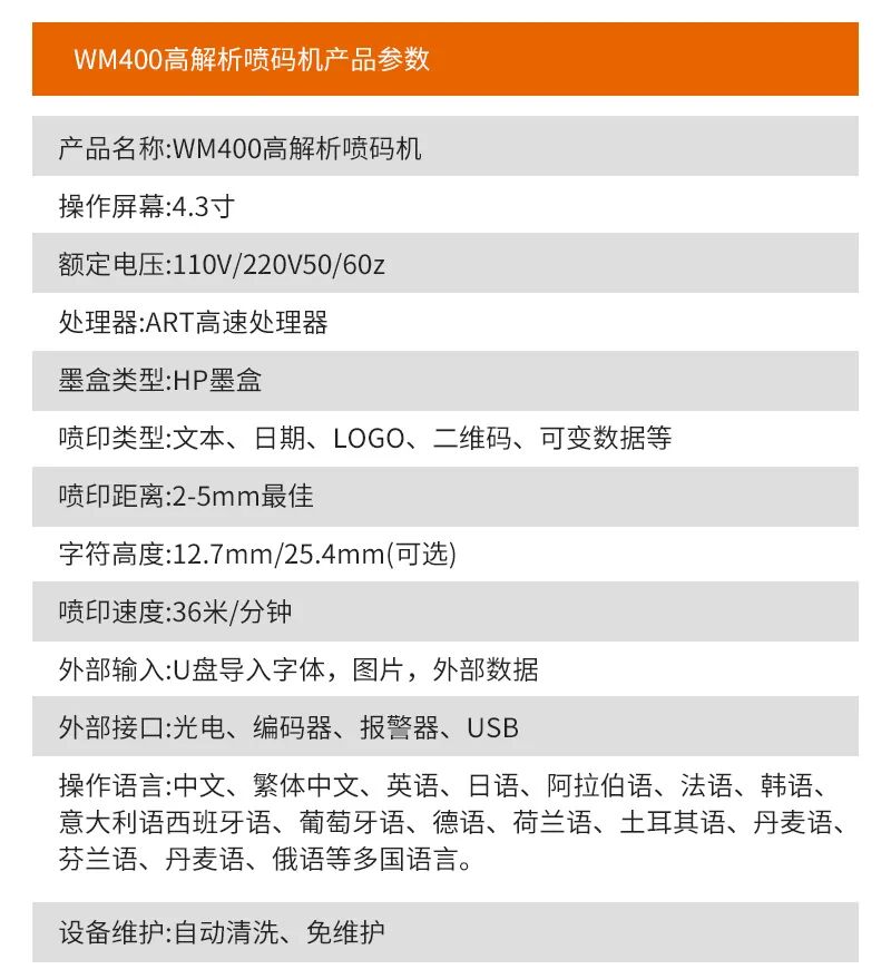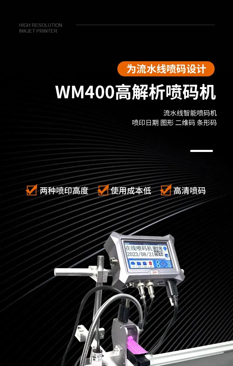 最重要的是,WM400在线式喷码机操作简单,只需触摸屏即可完成所有的设置和操作,无需专业的技术人员,节省了大量的人力成本。而且,由于采用了免维护的热发泡技术,它的使用寿命更长,大大降低了设备的维护成本。