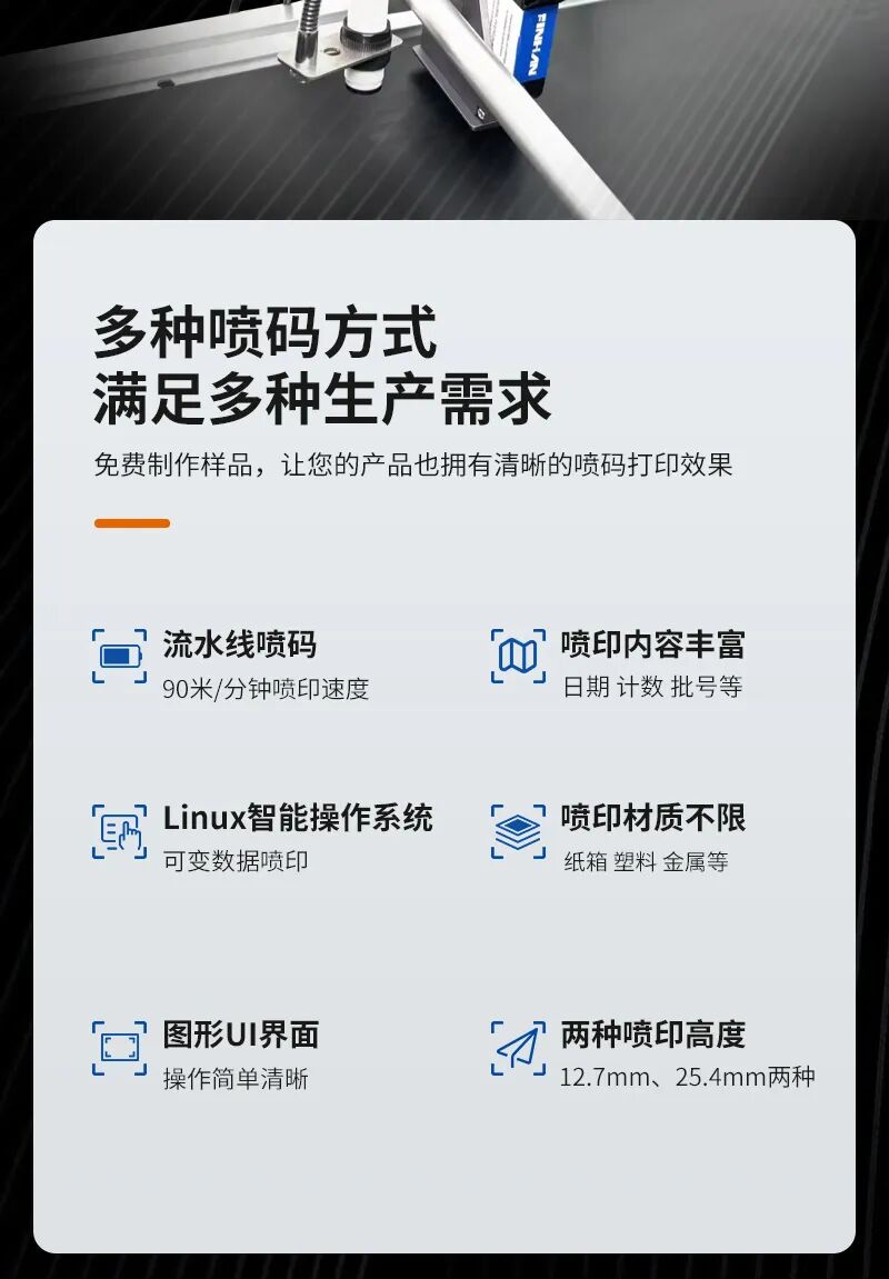WM400在线式喷码机是专为中小型企业和机械配套企业设计的高效标识设备。它采用先进的免维护热发泡技术,可以在各种产品上在线打印出生产日期、批号、条码、logo等信息,无论是在生产线上还是在仓库中,都能轻松实现产品的追溯和管理。