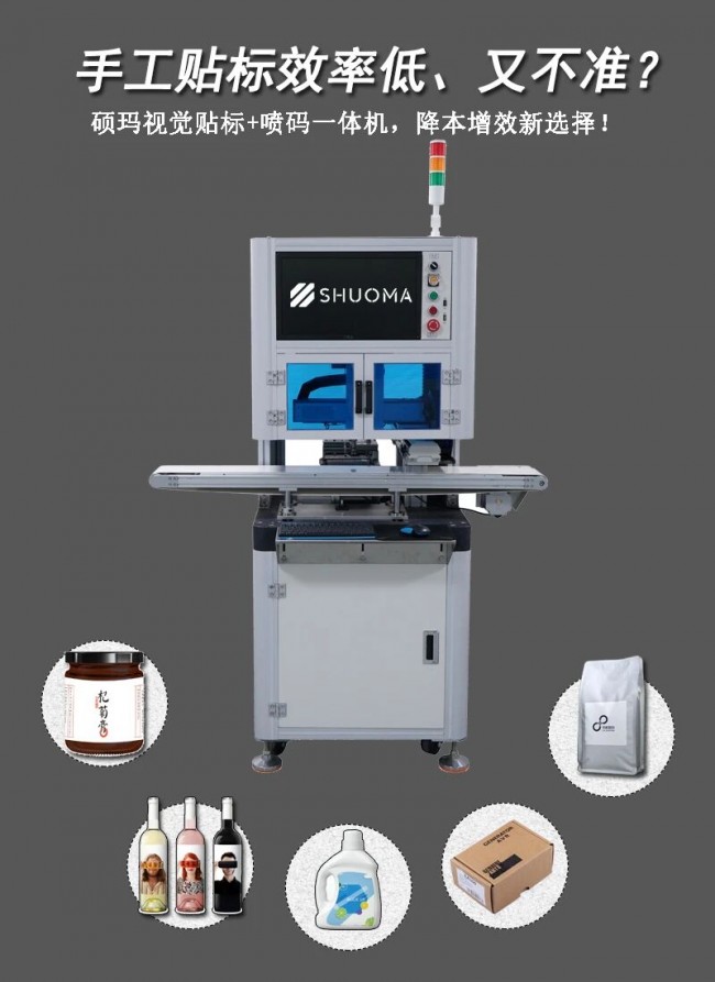 而硕玛视觉贴标 + 喷码一体机的出现,彻底改变了这一现状。这款设备融合了先进的视觉识别技术,能够精准捕捉产品位置,无论是平面产品,还是形状不规则的异型件,都能实现精准定位贴标,贴标精度远超人工操作,有效避免了因贴标不准带来的品质问题。同时,设备将贴标与喷码功能一体化,无需额外安排打码工序,产品在完成贴标的同时,即可同步实现喷码操作,大幅缩短了生产流程,生产效率得到显著提升。