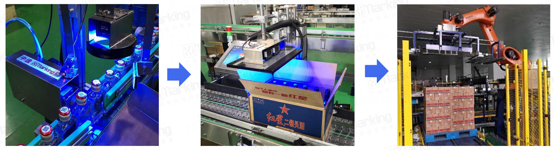 HiMarking采用 “盖→盒→箱→垛→瓶” 五级一码方案,实现产品多级包装数据精准关联,同时结合酒企产线流程实现工厂产线、原料来源、生产批次、罐装时间、包装运输、终端销售等全流程信息采集关联,任意一级扫码即可完成防伪、窜货预警、全链路溯源、营销返利四件事。