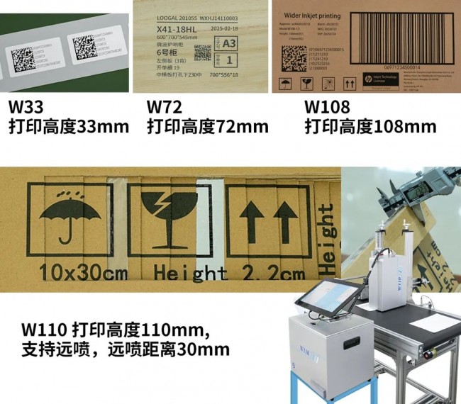 宽幅利器:W108、W72 、W110三款宽幅喷码机,喷印尺寸分别是108mm、72mm和110mm。针对瓦楞包装、板材、食品包装等场景中的大尺寸喷印需求,可一次实现宽幅喷码,无需拼接。现场将展示其在瓦楞纸箱、PVC 板材上的高效打印能力。