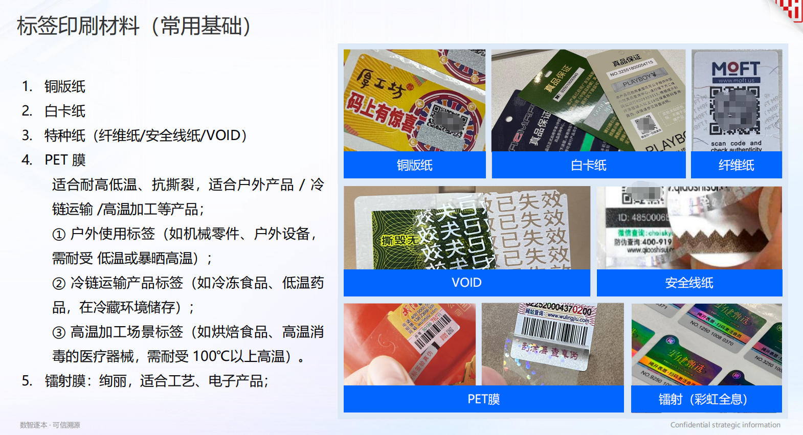 在材料应用上,HiMarking 提供丰富的基材选择并精准匹配场景需求:PET 膜耐高低温、抗撕裂,适配户外产品、冷链运输及高温加工场景;特种纸(纤维纸、安全线纸、VOID 材料)自带物理防伪属性,其中安全线纸在造纸过程中嵌入金属或塑料线,复印后安全线呈黑色,有效防复制;镭射膜则以绚丽的视觉效果提升产品档次,适配工艺、电子产品。同时,针对食品、药品等需要安全合规接触的产品,采用食品级油墨搭配铜版纸或膜类基材,确保使用安全。