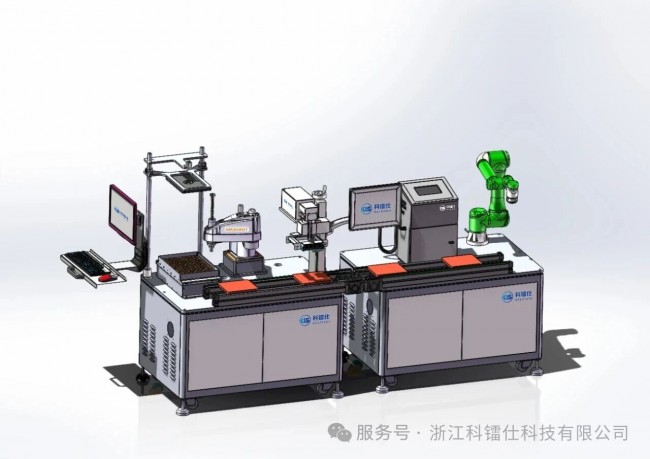 2. 同步赋码:科镭仕设备根据预设程序启动激光打标或 UV 喷码,在金属、塑料、玻璃等材质表面快速刻印追溯码、生产日期、logo 等信息,配合机器人的稳定加持,工业赋码又快又清晰;