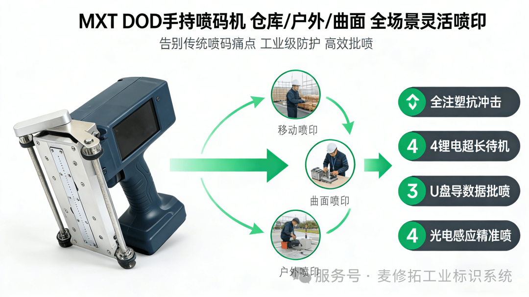 传统手持喷码机的痛点,早已成为制约企业标识效率的 “绊脚石”。有的设备仅支持固定角度喷印,面对大型纸箱、弧形管材等异型工件只能 “束手无策”;有的机身重量超 3kg,工人长时间握持后手臂酸痛,作业效率大幅下降;还有的在低温冷库、高温车间等极端环境下频繁罢工,耽误生产进度。 澳格 MXT DOD 手持喷码机从设计源头就瞄准这些痛点,给出了针对性解决方案: