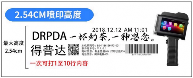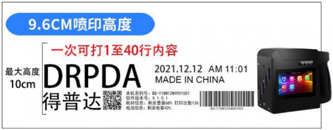高效智能操作,降低使用门槛,在快节奏生产环境中,喷码效率直接影响企业产能。得普达便携式喷码机搭载高清触控显示屏,界面简洁直观,如同操作手机般简单,即使是初次使用的员工,也能在几分钟内掌握日期、批号、LOGO、二维码等内容的编辑技巧。内置智能光电感测系统,精准对位、即按即喷,字符高度可在 0.8mm 至 9.6cm 间灵活调节,无论是食品包装上的精细批号,还是水泥袋上的醒目标识,都能清晰规整、远距离一目了然。配备环保快干墨盒,10 秒内即可固化,避免擦拭污染,同时支持千条文件存储与快速切换,大幅提升批量作业效率,让喷码速度比传统手工标识提升 5 倍以上。