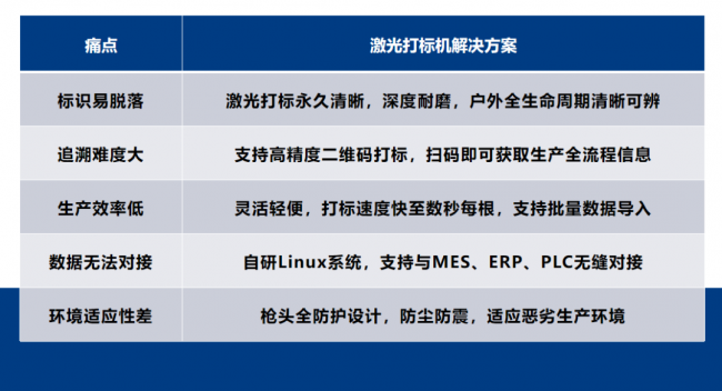 随着国家推进资产实物ID管理,要求每根电杆实现全生命周期可追溯,传统打标方式已无法满足其需求。同时,生产现场人工操作效率低、设备环境适应性差、存量电杆整改难度大等痛点日益突出,电杆行业亟需便携智能、永久清晰、可追溯的激光打标解决方案。