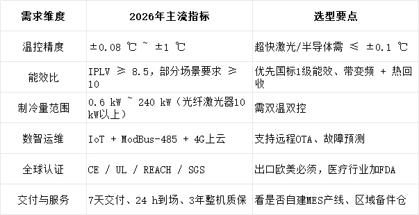 ≤1 kW选RMUP机架式;1-6 kW选CW/CWUL;6-20 kW选CWFL双温;20-240 kW选CWFL大双温或螺杆并联。