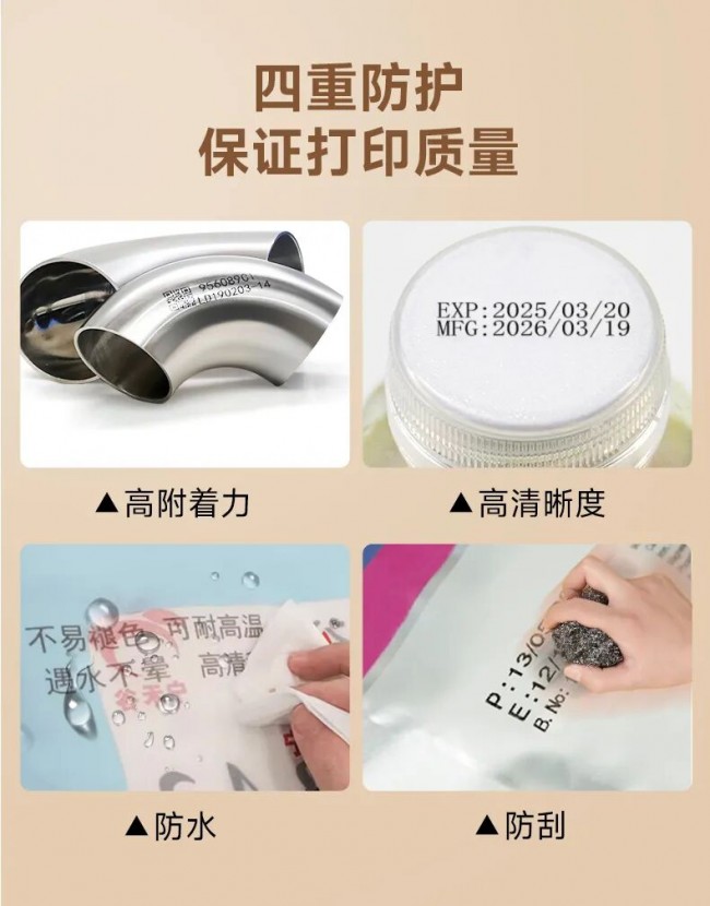 冷冻食品行业:低温环境下附着力稳定,标识不模糊、不脱落 水煮 / 抗磨损场景:专用溶剂墨,耐水煮、抗摩擦,标识持久清晰 高温工况:耐高温墨水,适配高温生产环境,标识不晕染、不变形