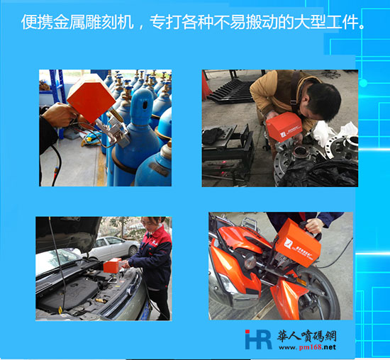 便携式小型气动打标机用途非常广泛,操作时将打印头整体放在备打物体表面,按下打印按钮,系统会自动打印出VIN号码或其它数字字母和汉字图片LOGO等;另外,通过附带的铭牌专用夹具,该设备还可兼作铭牌打印机,真正达到一机两用的目的。该机因其良好的便携性,因此还被用于某些大型物体表面打标。如石油管道、大型锯片、大型齿轮等。