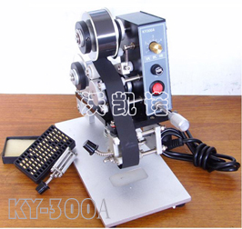 我公司生产的KY-300A手动打码机是在我公司生产的HP-30型(HP不是惠普的意思,是Hot printer热打印英文缩写)的基础上改进的新一代手动打码机。引进国际流行的热打印色带替代油墨,可在任何包装材料及皮革、布、纸、商标、小纸盒等材料上打印清晰的、不腿色的字符;换字方便,操作简单,操作速度采用手动控制,特别适用量少而品种繁多的包装打码工作。